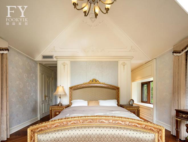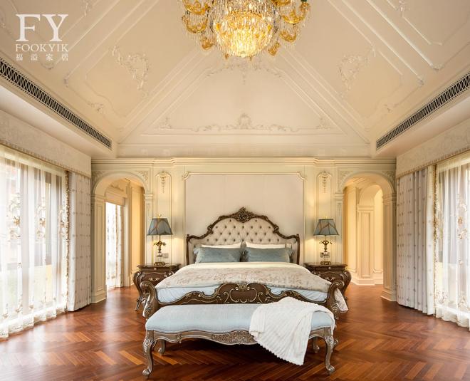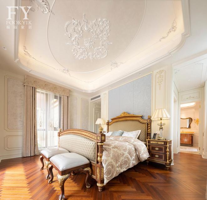 雕花床头华丽却不张扬,纹理细腻,手工描金工艺赋予其深邃而温润的光泽。搭配的同系列床头柜与床尾凳,实用性与艺术融,仿佛被贵族般的精致与舒适温柔环抱。