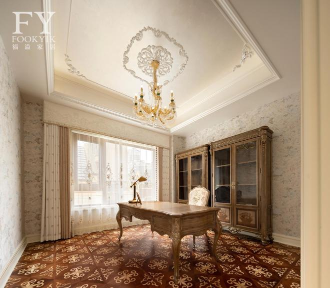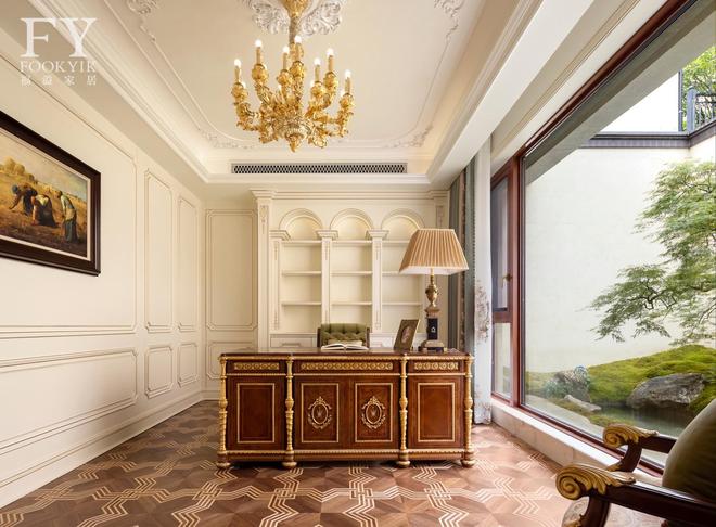 独立书房,是庄园主人思想的栖息地。书桌以雕刻描金纹路勾勒权力图腾,剑形雕花与权杖立柱暗藏王者气度。通透玻璃书柜收纳万卷智慧,每一处鎏金刻痕都在诉说思想交锋的凛然风骨。